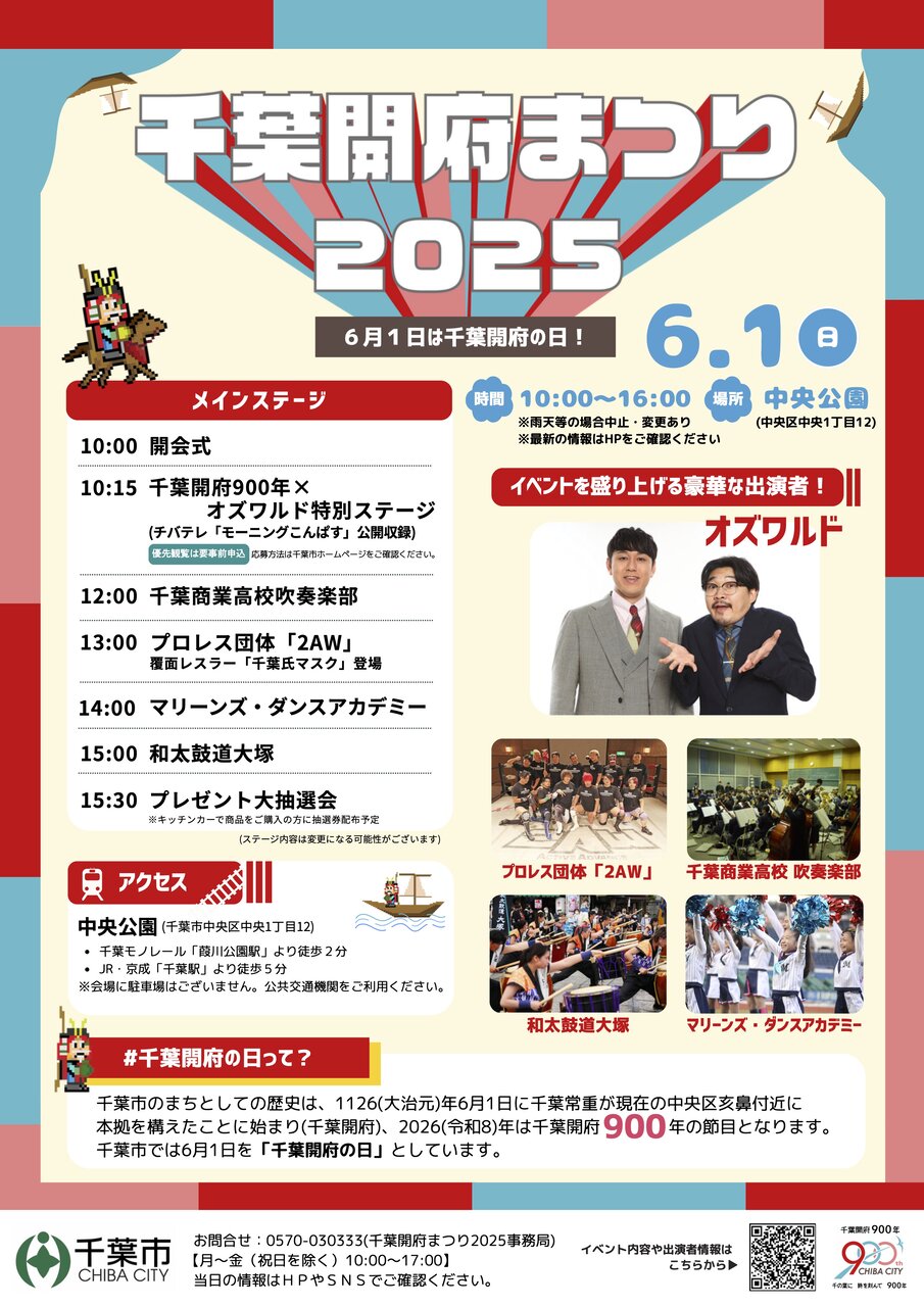 6月1日は千葉市が「千葉開府の日」としており、さかのぼること1126年6月1日に千葉常重が現在の中央区亥鼻付近に本拠を構えたことに始まり、来年2026年は千葉開府900年の節目にあたることから、あす6/1(日)は千葉市中央公園(千葉市中央区中央1丁目12)で『千葉開府まつり』(主催:千葉開府まつり2025事務局)が開催されます。