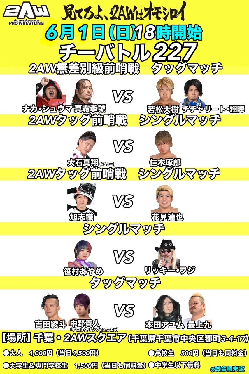 2AW無差別級前哨戦、2AWタッグ前哨戦が行われるほか、全5試合を予定。