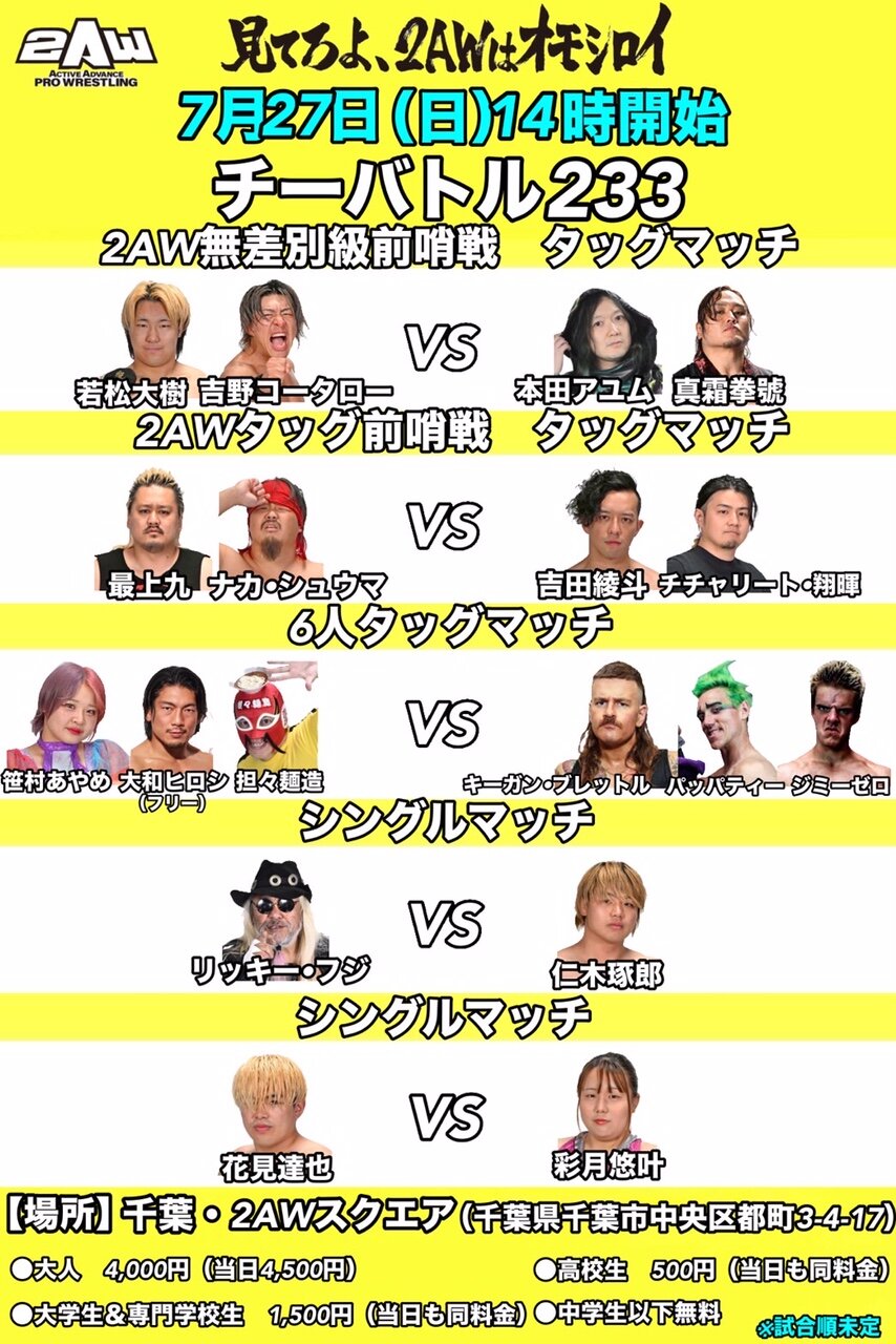 2025年7月27日(日)14時開始『チーバトル233』[千葉・2AWスクエア]の全カードが決定しましたので、お知らせ致します。