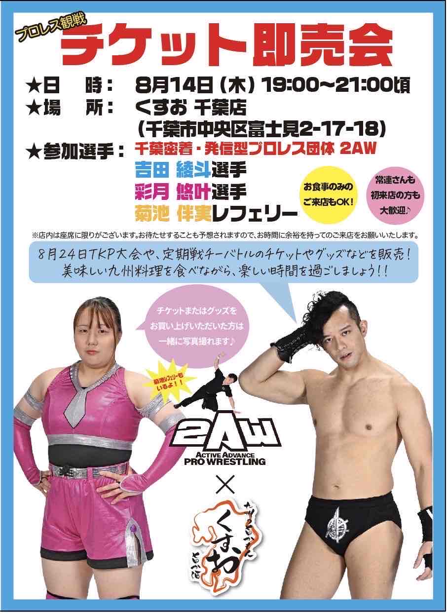 【内容】2AWグッズ 販売(オフィシャル・選手グッズ・ポートレート等)、大会チケット販売(8月24日TKPガーデンシティ千葉大会、チーバトルほか)