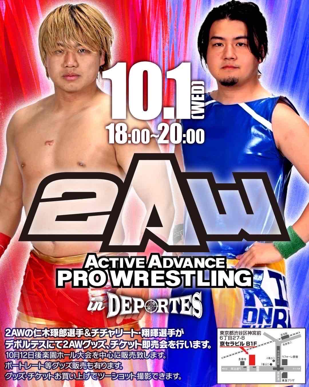 【内容】2AWグッズ 販売(オフィシャル・選手グッズ・ポートレート等)、大会チケット販売(10月12日 2AW後楽園ホール大会ほか)