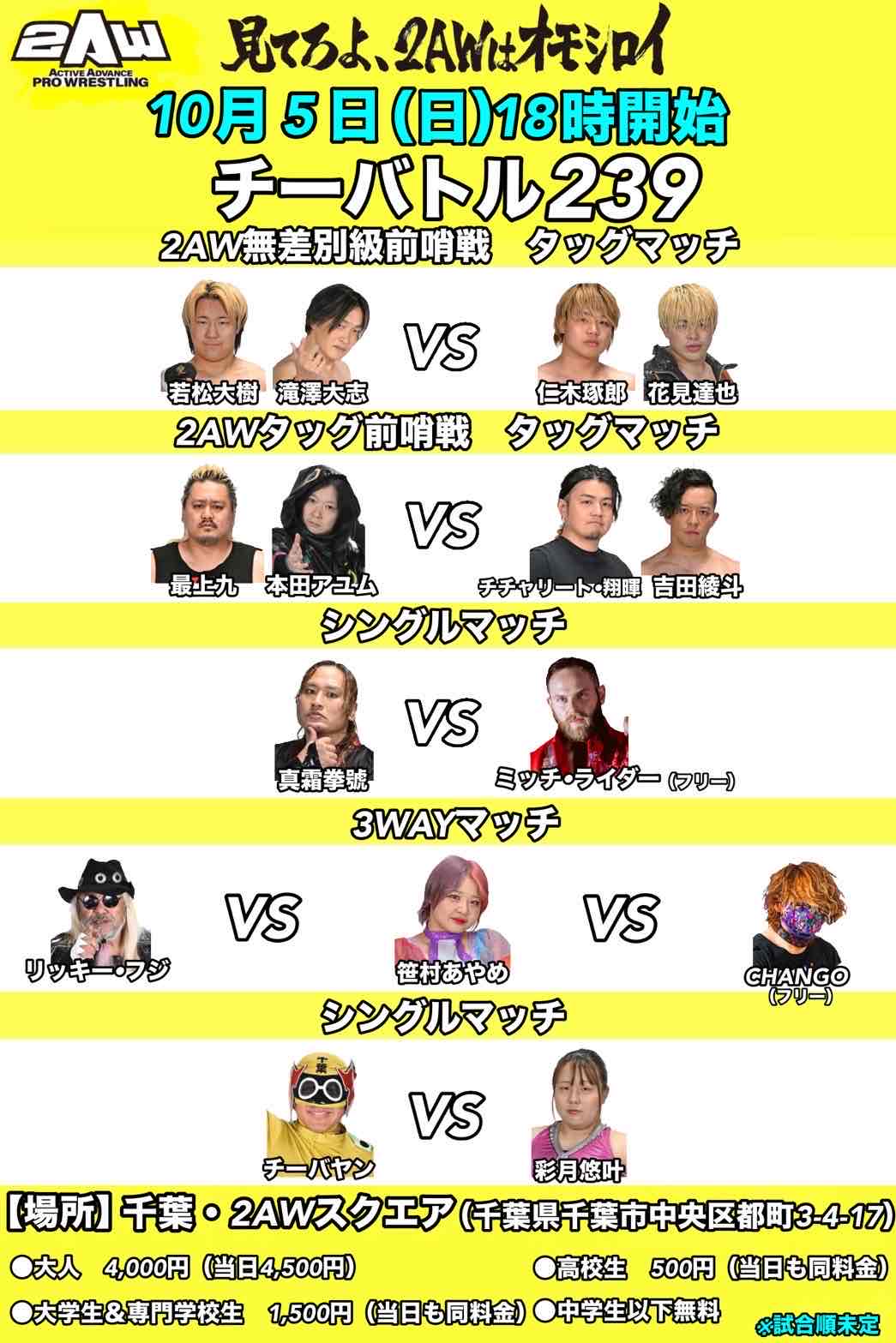 10.12 後楽園ホール大会直前 2AW無差別級前哨戦 若松 vs 仁木 、2AWタッグ前哨戦 最上 vs チチャリート、約5ヶ月振りの2AW参戦となるミッチは真霜とシングルマッチで対決。ほか全5試合を予定。
