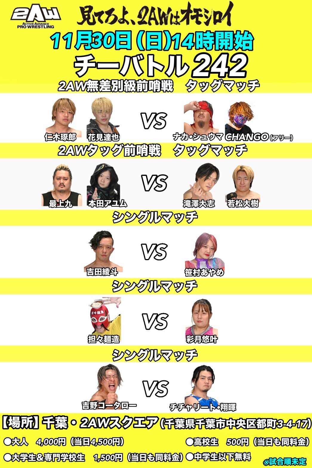2025年11月30日(日)14時開始『チーバトル242』[千葉・2AWスクエア]の全カードが決定しましたので、お知らせいたします。