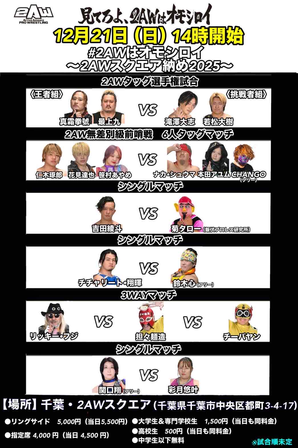 2025年12月21日(日)14時開始『#2AWはオモシロイ ~2AWスクエア納め2025~』[千葉・2AWスクエア]の全カードが決定しましたので、お知らせいたします。