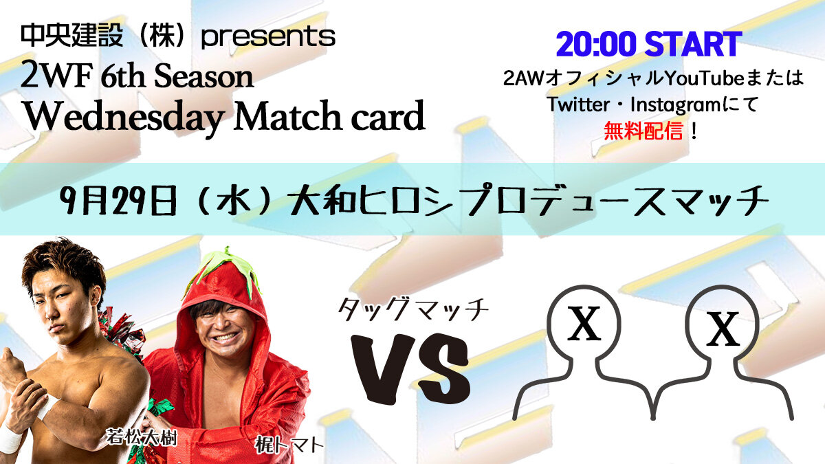 配信企画・WRESTLING WEDNESDAY and FRIDAY(通称2WF) season6 第5週目 9月29日(水)の対戦カードをお知らせ致します。